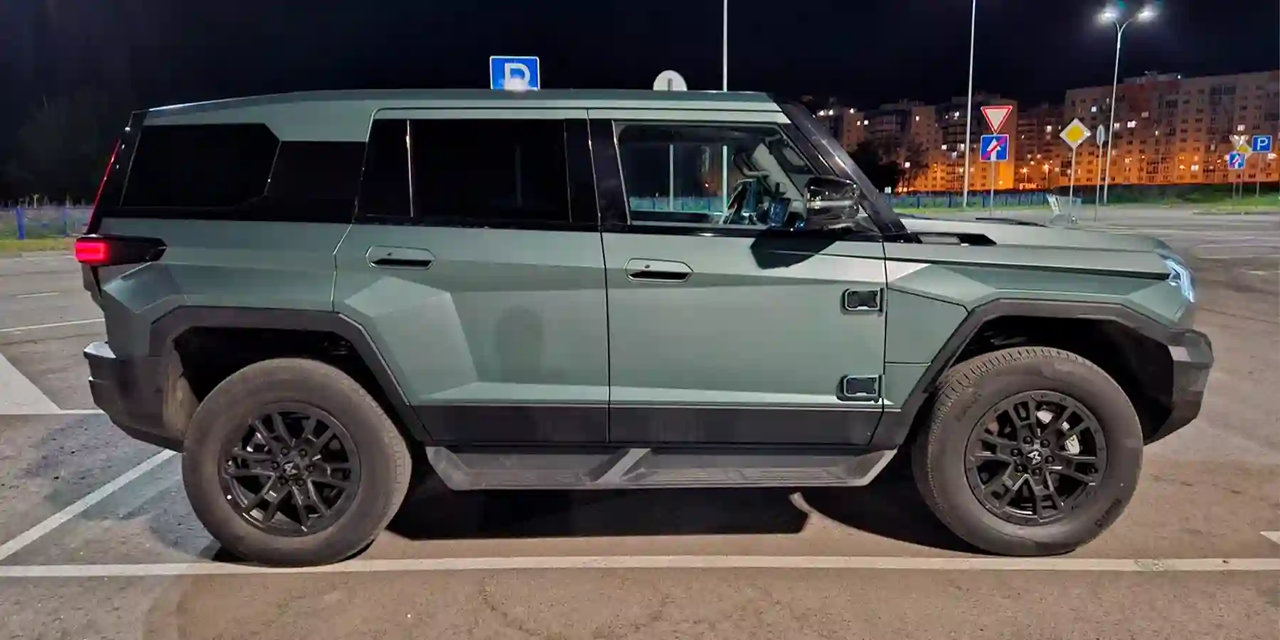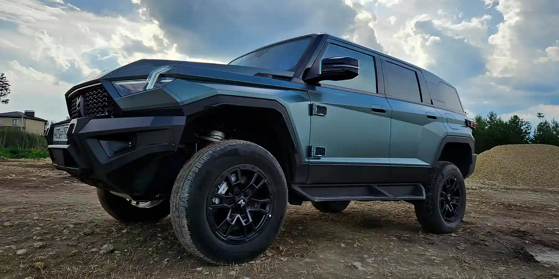 На тест нам достался самый интересный цвет под названием темно-зеленый (темно-зеленый). Есть еще черный Blackout и серый Titan. Машина в любом случае будет матовой, что только подчеркивает рубленые грани и сложные формы кузова. Можно выбрать один из нескольких вариантов резины и колесных дисков, также доступен набор фирменных аксессуаров.