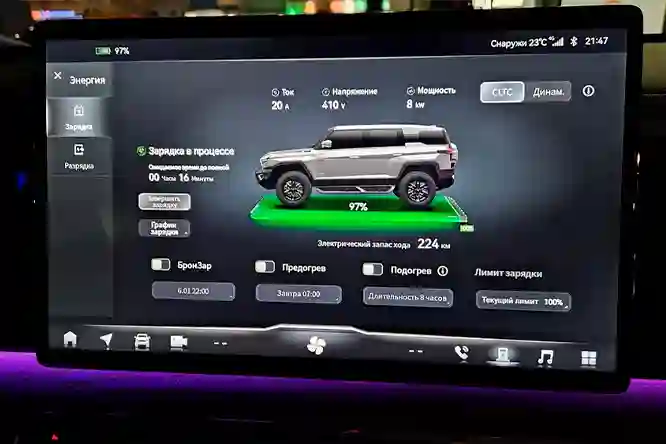 Центральный экран (15,6 дюйма) отзывчив и имеет приятную картинку. Китайского контента тут тоже немало, но в целом меню переведено неплохо, а само расположение пунктов и вкладок логично. Настроек множество: от проекционного экрана и водительских ассистентов до рекуперации и предварительного подогрева батареи по таймеру.