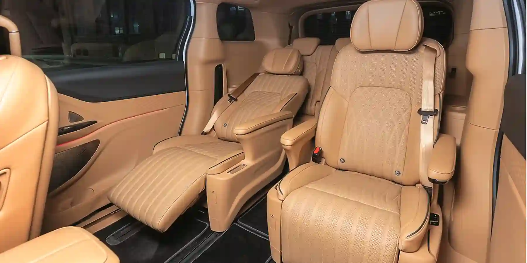 И самые значимые кресла в салоне максивэна — два на среднем ряду. Шикарные! У каждого электроприводы, выдвижная поддержка для ног, подогрев, вентиляция, массаж, зарядное гнездо и слот под смартфон. Есть общая центральная «тумбочка» с отсеками. И общий же потолочный пульт климатической установки, хотя лучше бы сделали личные пультики в подлокотниках.