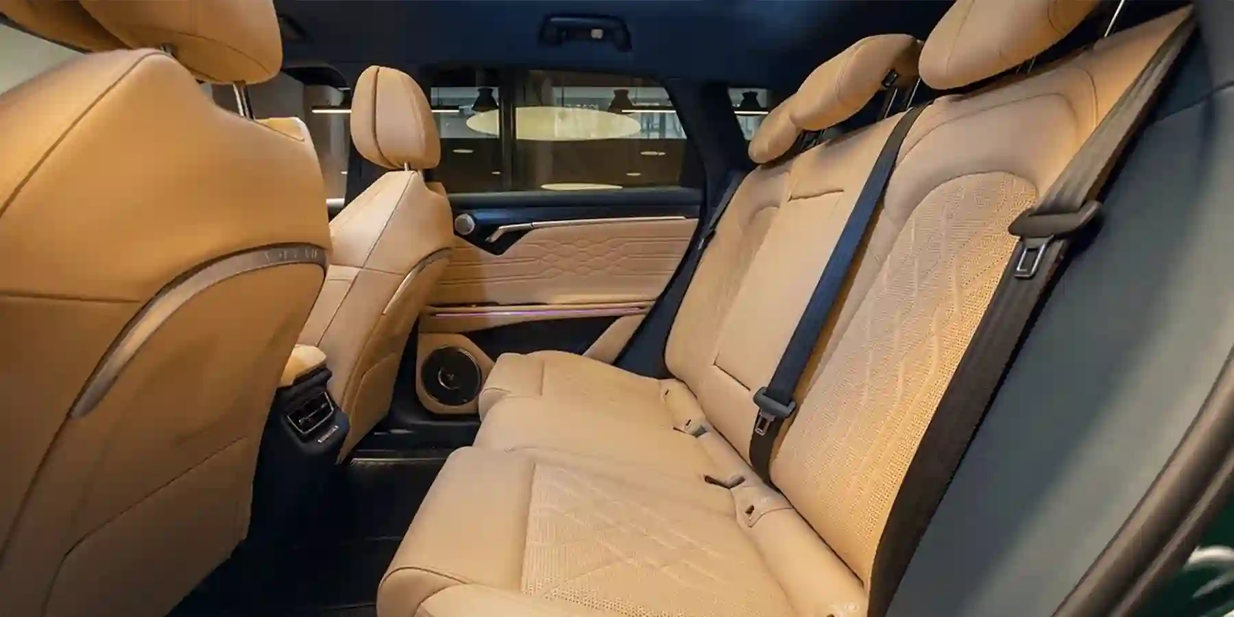 В передней части салона установлено три монитора — диагональю 12,3 дюйма каждый. Интерьер полностью обшит кожей, в том числе передняя панель и дверные карты. Всего доступно три варианта отделки: бежевый с тёмно-синим (как на фотографиях), чёрный с тёмно-синим и коричнево-красный с акцентами цвета слоновой кости.
